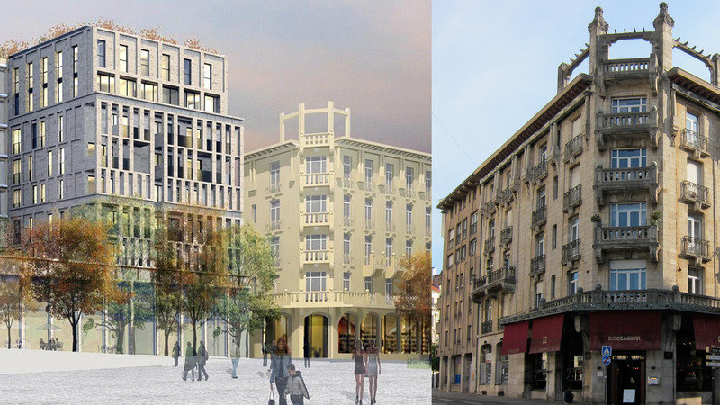 Le promoteur, Nouvel Habitat, a, quant à lui, présenté son immeuble comme le "miroir du bâtiment classé". Les deux photos ci-dessous vous permettront de juger par vous-mêmes ! Plus haut que l'Excelsior, quarante-cinq logements, neuf niveaux, une façade en loggias, la massivité (notez en particulier les deux étages supérieurs répondant aux quatre pilastres de l'ancienne salle à manger d'été, qu'il faudrait restaurer), quoi de comparable au chef-d'œuvre de l'École de Nancy ?