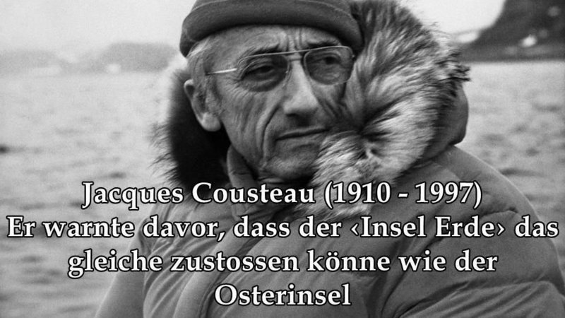 Weiter schreibt Cousteau, dass ihn die Menschenknochen auf der Osterinsel daran erinnert hätten, dass die Erde ein lebendiger Körper sei, ein zusammengefügtes System von exakt aufeinander abgestimmten, ständig sich verändernden Kräften wie das Meer und die Küste, die Bäume und die Wüste. Die Menschen seien auf der Osterinsel - wie auch anderswo - offenbar in einen natürlichen Prozess eingedrungen und hätten zu spät entdeckt, dass die von ihnen verursachten Schäden an der Natur nicht mehr ausgeglichen oder geheilt werden konnten. Die Folgen von Unwissen seien genauso fatal wie die Folgen unverantwortlichen Verhaltens. Nach Cousteaus Meinung müssten wir alle aus der traurigen Parabel der Osterinsel lernen. Wir müssten unsere Erde als Insel ansehen und begreifen, dass ihre Ressourcen genauso begrenzt sind wie die der Osterinsel. Er warnte davor, dass der ‹Insel Erde› das gleiche zustossen könne wie der Osterinsel, wenn unsere Kernkraftwerke schmelzen, unsere giftigen Abfälle die Gewässer verseuchen und die von der Menschheit gehorteten Unmengen von Raketen und Bomben abgefeuert würden. Weiter gab er seiner Hoffnung Ausdruck, dass wir den Reichtum menschlichen Erfindungsgeistes, unsere Erfahrung und Weisheit lieber an lebende Nachfolger weitergeben sollten. Schliesslich gab er den Inselbewohnern recht, die über sich selbst gesagt haben sollen: «Wir sind nicht die Opfer eines bösen Gottes, sondern die Opfer all der Übel, die wir selbst geschaffen haben.»