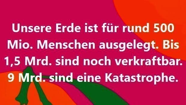 "Er (Anmerkung: Aldous Huxley) sagte einen Satz, an den ich mindestens einmal in der Woche denke: «Das Problem der Überbevölkerung, ungelöst, wird all unsere anderen Probleme unlösbar machen. Alle Ärgernisse, die uns bedrängen, die Umweltverschmutzung, das Ozonloch, Energienot können Sie auf die Überbevölkerung zurückführen.» Nach meinen Überlegungen und Berechnungen kann unser ‹Raumschiff Erde› etwa eine Milliarde Menschen tragen. Eine grössere Zahl von Menschen beginnt, eine Verschmutzung für unsere Erde zu werden. Zwei Milliarden sind noch zu ertragen, vier Milliarden sind furchtbar, heute sind wir fünf, werden demnächst sechs und zehn Milliarden Menschen auf der Erde sein. Das kann nur eine Katastrophe geben."