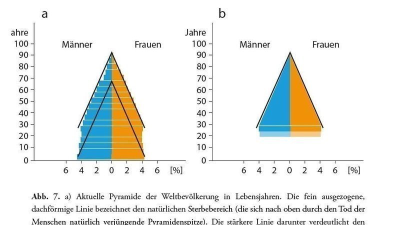 Abbildung 7a) Aktuelle Pyramide der Weltbevölkerung in Lebensjahren. Die fein ausgezogene, dachförmige Linie bezeichnet den natürlichen Sterbereich (die sich nach oben durch den Tod der Menschen natürlich verjüngende Pyramidenspitze). Die stärkere Linie darunter verdeutlicht den in 20 Jahren zu erwartenden Sterbebereich.