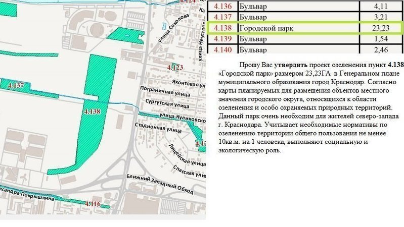 1. Прошу Вас утвердить проект озеленения пункт 4.138 «Городской парк» размером 23,23ГА в Генеральном плане муниципального образования город Краснодар ул Дзержинского между музеем Моя Россия и Баскет холлом. Согласно карты планируемых для размещения объектов местного значения городского округа, относящихся к области озеленения и особо охраняемых природных территорий. Данный парк очень необходим для жителей северо-запада г. Краснодара.