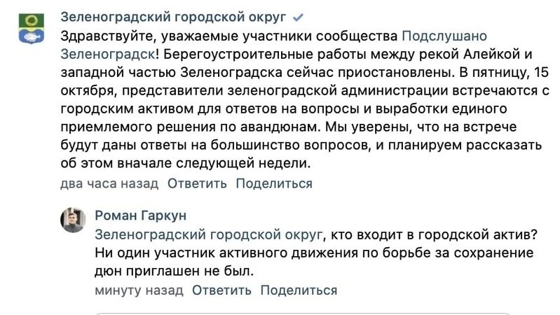 Сегодня инициативная группа отправила заявление в администрацию города Зеленоградска с списком фамилий. Боюсь временная остановка экскаваторов, окажется только временной. И сейчас пройдут фиктивные встречи с фиктивной общественностью и администрация получит фиктивное разрешение продолжить работы.