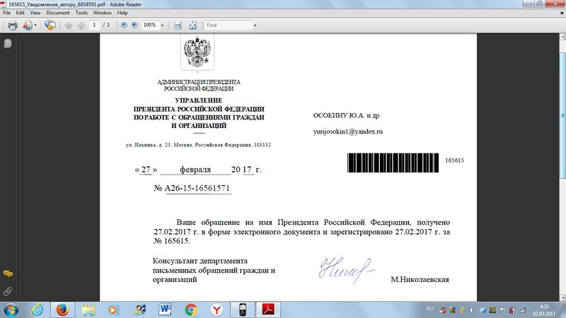Наше коллективное обращение на имя Президента Российской Федерации Владимира Владимировича Путина принято к рассмотрению и зарегистрировано 27 февраля администрацией Президента Российской Федерации.