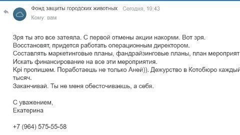 Не хотелось обнародовать это, но Директор Фонда защиты городских животных Екатерина Дмитриева, мой бывший партнер отобрала у меня мои же, мной созданные проекты и уволила меня за прогул, когда я отказалась уходить сама без проектов.