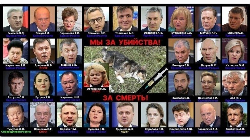 Группешка садистов не успокаивается. По всей стране заработали ПВС, где бездомных животных убивают спустя несколько дней. Ловят собак на улицах такие же отморозки-садисты, только не в пиджаках и галстуках, как Володин или Хамзаев. Мгогие собаки и щенки погибают от удавок или крюков там же.. Живодерка Останина хочет запретить видеофиксацию живодерских отловов и препятствование его. За противостояние живодерам при отлове садисты в думе хотят ввести наказание. Наказание людям! Противостоящим убийцам. Вон как Окно Овертона заработало в России!!!