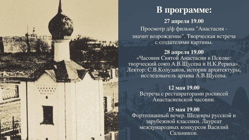 Дорогие друзья! Приглашаем вас 15 мая в 19.00 в старинный Дом Телешова на торжественное закрытие выставки «Хранительница Пскова», посвященной Анастасиевской часовне – уникальному историческому памятнику в создании которого участвовали выдающиеся деятели отечественной культуры – архитектор Алексей Щусев и художник Николай Рерих (автор эскизов росписей).