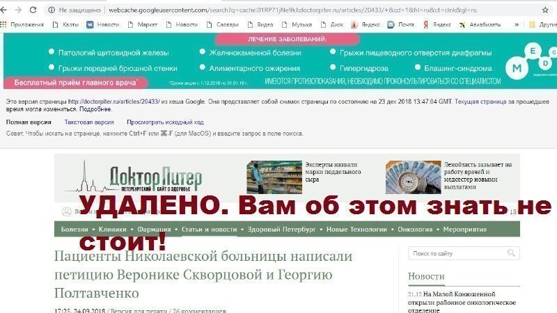 Любопытно также, что ранее на основании пресс-релиза Территориального Фонда обязательного медицинского страхования издание «Доктор Питер» разместило рейтинг Санкт-Петербургских больницы по уровню летальности (кол-во умерших пациентов, относительного общего числа проходивших лечение, в %), в котором Николаевская больница занимала печальные верхние строчки. Эта информация также не доступна на сайте издания, её можно отыскать с использованием инструментов поиска в кэше сайтов, а также в виде скопированных текстов в тематических сообществах в социальных сетях. Совпадение? Может быть и нет. Нам пришлось обратиться в Союз журналистов и комиссию по этике, может быть они подскажут нам случайно ли это *(см. заявление во вложении)