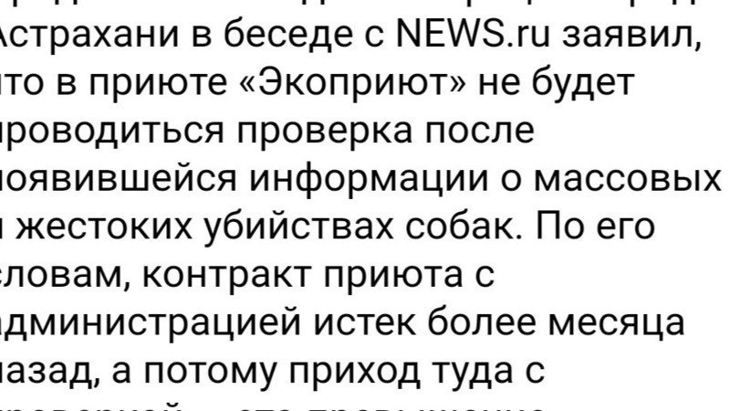 Власти Астрахани заявили, что не пойдут с проверкой в «живодерский» приют Представитель администрации города Астрахани в беседе с NEWS.ru заявил, что в приюте «Экоприют» не будет проводиться проверка после появившейся информации о массовых и жестоких убийствах собак. По его словам, контракт приюта с администрацией истек более месяца назад, а потому приход туда с проверкой — это превышение полномочий. Источник подчеркнул, что проверка со стороны правоохранительных органов уже ведется.Представитель администрации Астрахани в беседе с NEWS.ru заявил, что в «Экоприюте», который в Сети уже прозвали «живодерским», не будет проводиться проверка после сообщений о массовых и жестоких убийствах собак. По его словам, контракт приюта с администрацией истек более месяца назад, поэтому проверка будет свидетельствовать о превышении полномочий. Источник подчеркнул, что проверка со стороны правоохранительных органов уже ведется.