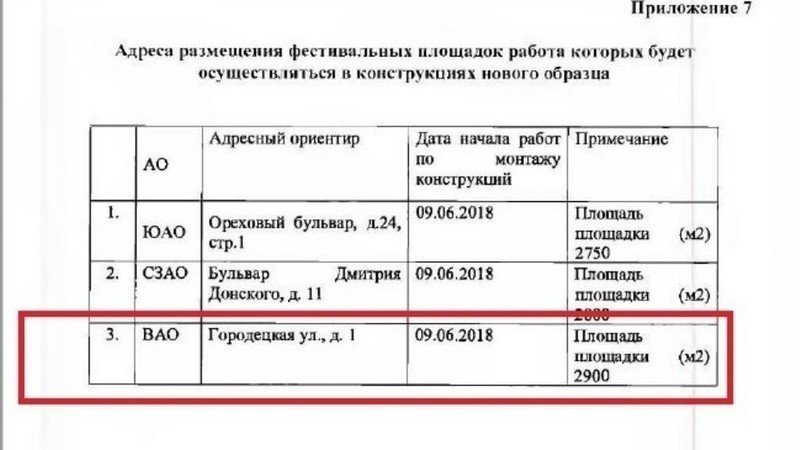 В пользовании имеется протокол заседания комитета по обслуживанию городских фестивальных мероприятий от 14 мая! За два дня до приезда Собянина в Новокосино, что было 16 мая, где его якобы “жители” попросили расширить фестивальную площадку, и по которой после был назначен опрос населения. В протоколе уже был указан адрес Городецкого бульвара (ул.Городецкая д.1) в перечне размещения фестивальных площадок с новым типом застройки и периодом монтажа и указана дата начала монтажа 09.06.18. Также имеется акт обследования инспекции по недвижимости, где в последнем абзаце указано, что работы по организации и размещению проводятся согласно протоколу от 14 мая 2018 года, а не после всяких псевдоголосований