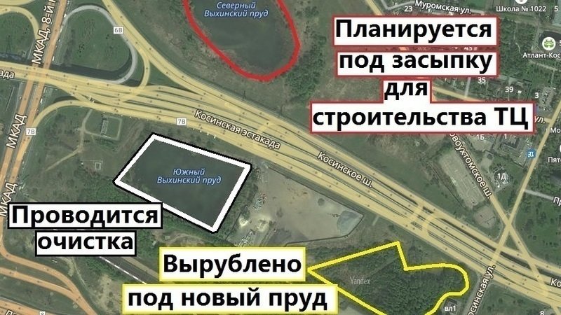 Недавно началась подготовка ко всей этой перепланировки территории. Как известно, вся территория севернее Косинской эстакады отдана под строительство торгового центра. На кадастровой карте уже давно сформирован участок с видом использования “Для размещения объектов торговли”, а Северный Выхинский пруд же планируется под засыпку.