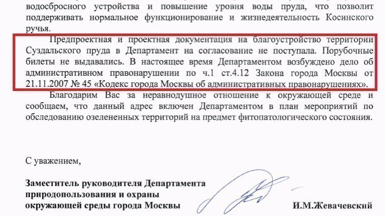 О как, работы на пруду ведутся уже с июля, а Департамент природопользования и охраны окружающей среды сообщает, что предпроектная и проектная документация к ним не поступала и возбудил дело об административном правонарушении по ч.1 ст.4.12 Закона города Москвы № 45 "Кодекс города Москвы об административных правонарушениях"