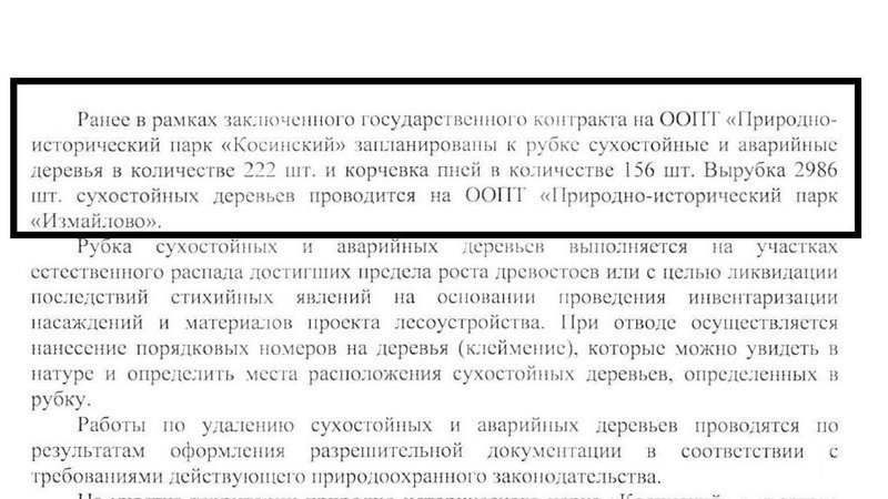Как следует из ответа Департамента Природопользования по масштабной вырубке деревьев, в нашем ПИПе Косинский к рубке запланированы 222 дерева, это сухостойные и аварийные. Остальные деревья около 3 000 штук будут вырублены в Измайлово