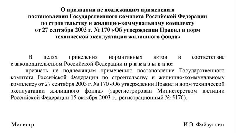 Проект Приказа «О признании не подлежащим применению постановления Государственного комитета Российской Федерации по строительству и жилищно-коммунальному комплексу от 27 сентября 2003 г. № 170 «Об утверждении Правил и норм технической эксплуатации жилищного фонда»: https://regulation.gov.ru/projects#npa=135215