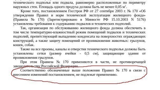 Если совсем кратко - 170 постановления Госстроя 2003 года не может применяться в той части, которая противоречит новому постановлению! Пункты 3.4.1 и 3.4.7 устарели и НЕ ПОДЛЕЖАТ ПРИМЕНЕНИЮ! Это те пункты, которые касались не допущения в подвалы кошек и установки сеток. Еще раз, они больше НЕ ПРИМЕНЯЮТСЯ.