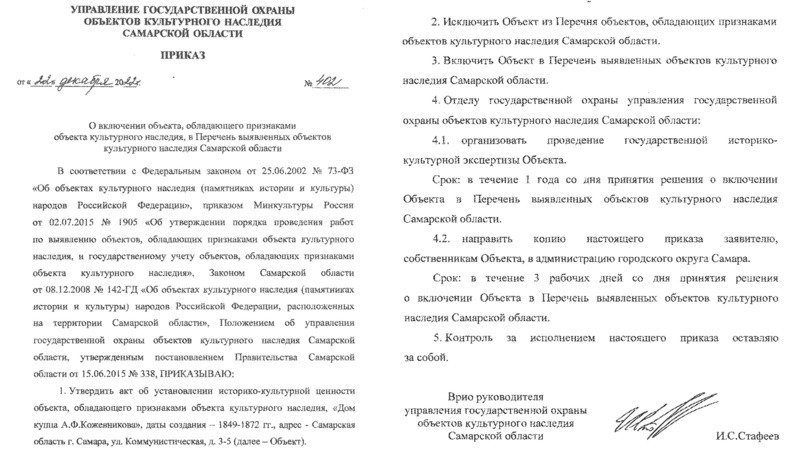 Друзья, в канун новогодних праздников мы можем обрадовать вас хорошей новостью! 22 декабря был опубликован приказ Управления государственной охраны объектов культурного наследия Самарской области №402 о включении объекта «Дом купца А.Ф. Кожевникова» в списки выявленных объектов культурного наследия. Теперь в течение года должна быть проведена государственная историко-культурная экспертиза, после чего он, наконец, окончательно станет охраняемым памятником. Именно этого мы изначально добивались и именно к этому готовились, поэтому надеемся, что оставшиеся этапы не займут много времени, а новый статус дома не затруднит ведущиеся работы по его сохранению. Благодарим всех, кто поддержал наше обращение и участвовал в судьбе Дома с часами. Именно благодаря вам уходящий год ознаменовался для него столь значительными переменами к лучшему. Будем надеяться, что они продолжатся и в новом году. С наступающим!