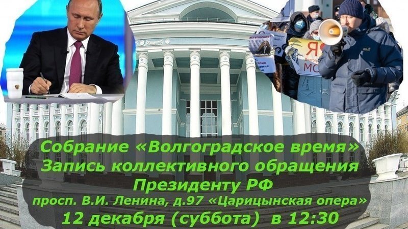 Мы призываем вас задавать вопросы лично, а так же приглашаем на запись коллективного обращения президенту, которая состоится 12.12.2020 г. (суббота) в 12:30 на площади перед зданием Царицынской оперы (Краснооктябрьский р-он по первой продольной).