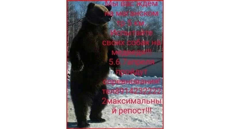«Wir erwarten Sie auf dem Maganskiy Trakt, 5. км. Trainieren Sie Ihre Hunde an dem Bären am 5.,6.,7. April . Tel. : 8-914-232-22-22».