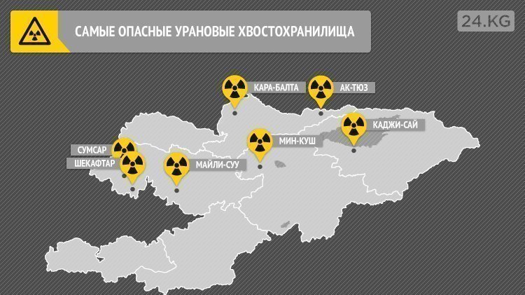 - - В поселке Каджи-Сай после закрытия рудника имеется 2 урановых золоотвала и один отвал с закопанным радиоактивным оборудованием, которые были перекрыты метровым слоем глины