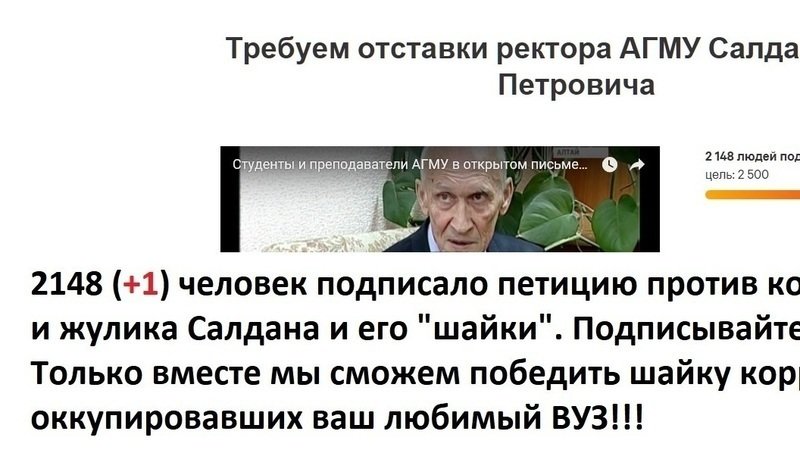 Petition updateТребуем отставки ректора АГМУ Салдана Игоря Петровича и проверки деятельности АГМУ !!!2148 человек подписало петицию за отставку ректора Салдана!!!