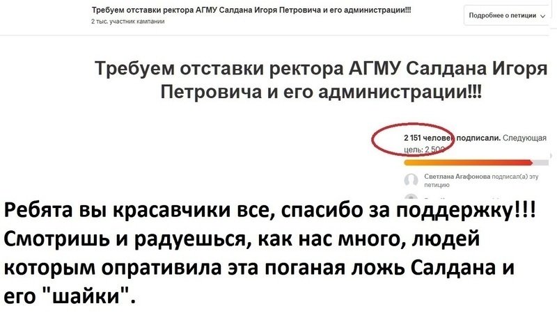 С каждым днем наша петиция набирает силу, против лжи ректора Салдана и его "администрации". И рано или поздно, мы добьёмся того, что человек который разрушает наш университет, будет уволен, а вместе с ним и та "позорная" администрация, которая всеми силами разваливает наш университет. АГМУ вылетел из всех наиболее значимых рейтингов, преподаватели уходят, материальная база не обновляется, при этом зарплата ректора год от года растет, при этом сам ректор втихаря занимается бизнесом.