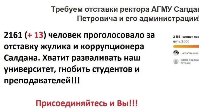 Petition updateТребуем отставки ректора АГМУ Салдана Игоря Петровича и проверки деятельности АГМУ !!!2161 человек высказались за отставку ректора Салдана