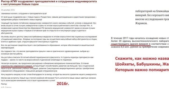 Вот 2016 г. Игорек обещает, строить виварий http://www.agmu.ru/news/rektor-agmu-pozdravliaet-prep.. как раз под НГ, может думает забудут? Ему вторит проректор по науке Жариков http://politsib.ru/news/92254 и теперь 2018 год и тадада ,"строить мы ничего не будем", я опять «пизднул» http://asmu.ru/novosti/index.php?NEWS=18582&sphra..