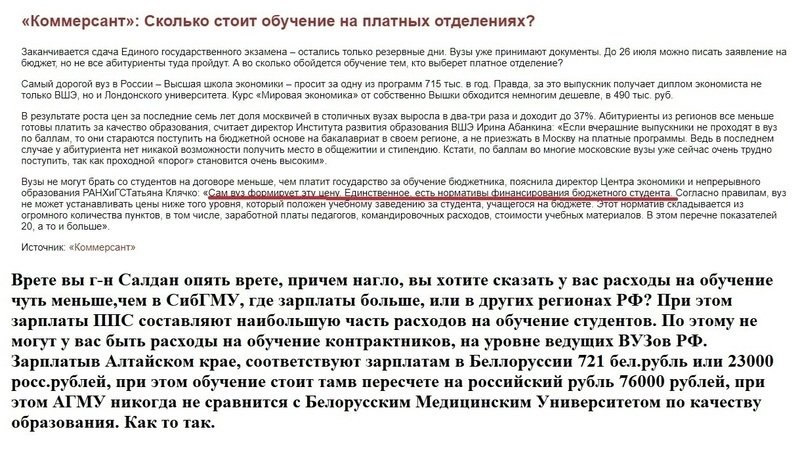 Что бы "стричь" деньги и дальше, администрация АГМУ ищет всевозможные статьи и выдержки, что все законно, у нас расходы такие 130.000 рублей в год на каждого студента ога. Причем ректорат даже не вчитывается, не может быть почти одинаковой цена за обучение, но в регионах где находятся ВУЗы разница в заработной плате разнятся до 50%. А поскольку заработная плата составляет большую часть затрат на обучение, ректор нагло обманывает общественность. Для сравнения 2 региона, Алтайский край, где ср. заработная плата- 23000 и Томская область с зар.платой в 38.000 рублей? А разница в стоимости обучения между АГМУ и СибГМУ на лечебном факультете 16.600 рублей. По этому делайте выводы, почему с контрактников ректор Салдан дерет в "три шкуры" и почему обучение в более сильных университетах не намного дороже.