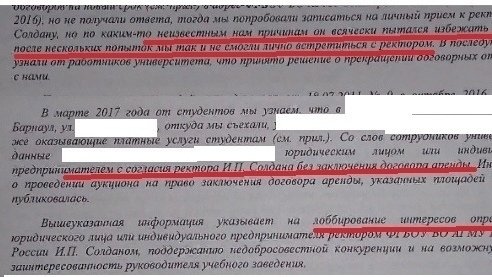 К нам обратилось руководство одной из фирм, арендующее помещение в АГМУ и оказывающее услуги АГМУ, скажем так. Что вышло, по окончанию договора Салдан ничего не объясняя, выкинул эту компанию и разрешил заехать другой компании и предоставлять услуги без конкурса и договора, иззи. Обращение в прокуратуру так же не помогло. Вот такой усатый жулик, одних выпихивает, других ставит, своих «прикормленных». И что встречаться, не хочет это так на Игорька похоже, хотя по закону добросовестный арендатор имеет преимущественное право на аренду помещения, если за ним нет задолженностей за аренду и прочих нарушений. И странно, что данная компания не стала судится, с Салданом, по-другому нельзя, он не понимает по хорошему, с ним надо с позиции, силы, прокуратуры, полиции, суда наконец, как В.П. Куликов сделал выиграв суд о защите чести, достоинстве и деловой репутации.