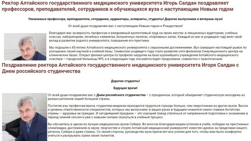Еще одно доказательство, что Салдан уже не ректор, сейчас будет выставляться обращения, приказы, поздравления и т.д. "от имени Салдана" с одной фотографией, "Дорохой Леонид Ильич передает пламенный привет..." В мероприятиях ВУЗа на 2019 г. данный человек не значится, даже стоит подпись И.О. ректора-https://www.asmu.ru/upload/medialibrary/c9c/Plan-orgaizatsionny-meropriyatiyakh-na-2019-g..pdf