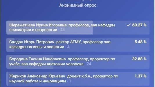 Мы провели голосование, АНОНИМНОЕ, разумеется, на текущий момент проголосовало 73 человека, большинство 60,2 % проголосовало за Шереметьеву Ирину Игоревну, профессора зав. кафедрой психиатрии и неврологии.