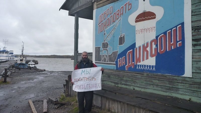 На заставке: руководитель КРОЭО "Природа Сибири" Игорь Чапалов с плакатом "Мы против могильника", п. Диксон, 2017 год.