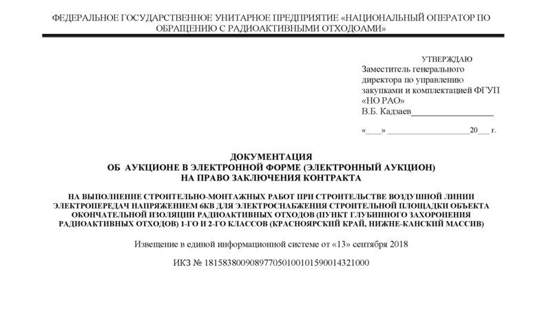 «Наименование выполняемых работ: Выполнение строительно-монтажных работ. Строительство воздушной линии электропередач для электроснабжения строительной площадки объекта окончательной изоляции радиоактивных отходов (пункт глубинного захоронения радиоактивных отходов) 1-го и 2-го классов (Красноярский край, Нижне-Канский массив).