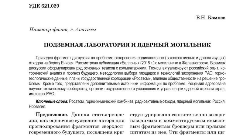 Для тех, кому не понятно, почему именно в этом издании опубликован этот материал и при чём здесь Норильск, поясню. Дело в том, что В.Н. Комлев предлагает в качестве одного из возможных решений по созданию могильника такого класса использовать выработки "Норильского Никеля". Так что журнал для публикации был выбран неслучайно.