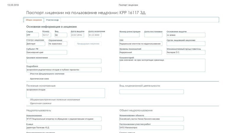 Информационный портал БАБР опубликовал паспорт лицензии на право захоронения самого опасного радиоактивного мусора (срок вредоносности многие тысячи лет!) возле города-миллионника - Красноярска. Как могилостроители не пытались её прятать - ничего не вышло. Эту лицензию наши замечательные власти умудрились выдать без надлежащей геологоразведки, до получения положительного результата научных исследований и даже до создания своей мифической подземной исследовательской лаборатории! Казалось бы, это невозможно в правовом государстве. Но это факт. См. здесь http://babr24.com/kras/?IDE=198397 .