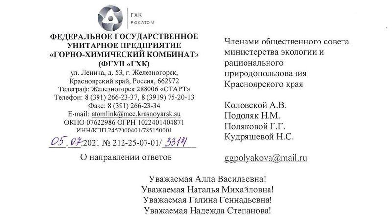 Разумеется, такие ответы активистов не устроили, и сегодня в адрес генерального директора ГХК улетело новое письмо с просьбой надлежащим образом соблюдать российское законодательство и предупреждением о возможных последствиях (см. здесь https://disk.yandex.ru/d/WMEzuGw2P45Isg ). Раз пошла такая тема, то администрация Железногорска может нарваться ещё на один судебный иск.