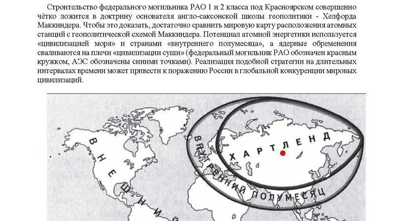 Пять лет назад я направлял аналогичные по духу обращения в различные инстанции, в том числе, и в Академию геополитики. К этому обращению я прикладывал свою статью из "Сегодняшней газеты" с такой вот замечательной картинкой. Все эти инстанции я предупреждал, что создание международной инфраструктуры обращения с РАО и ОЯТ в центре континентальной части РФ противоречит её стратегическим интересам и с точки зрения основ геополитики подрывает национальную безопасность России на всю историческую перспективу.