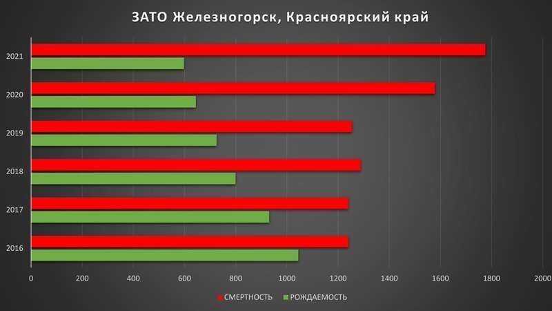 Куда же движется Россия, и куда тащит её нынешний управленческий корпус? Ответ даёт незатейливая картинка, касающаяся ключевых жизненных показателей за последние несколько лет относительно благополучного провинциального городского образования РФ - ЗАТО Железногорск (Красноярск-26). Аббревиатура ЗАТО означает "закрытое административно-территориальное образование". Проще говоря, речь идёт о городе, окружённом забором из колючей проволоки, жизнь в котором регулируется специальным режимом.