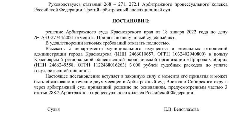 Общественные активисты одержали победу в непростом судебном процессе. Третий арбитражный апелляционный суд, в лице судьи Белоглазовой Е.В., отменил решение Арбитражного суда Красноярского края по иску администрации города Красноярска к Красноярской региональной общественной экологической организации "Природа Сибири" о взыскании за пользование офисом более полумиллиона рублей. Финансовая кувалда разлетелась на мелкие осколки.