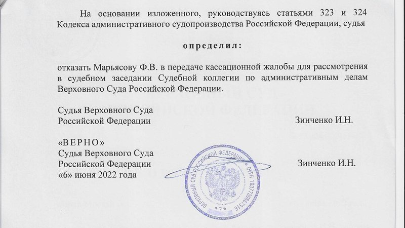Судья Верховного Суда Российской Федерации Зинченко И.Н. не смогла установить основания для передачи кассационной жалобы в Судебную коллегию ВС РФ. Дело даже до судебного заседания не дошло. Речь идёт об иске общественных активистов к администрации ЗАТО Железногорск по слушаниям о вводе в эксплуатацию производства по переработке ОЯТ на Горно-химическом комбинате.