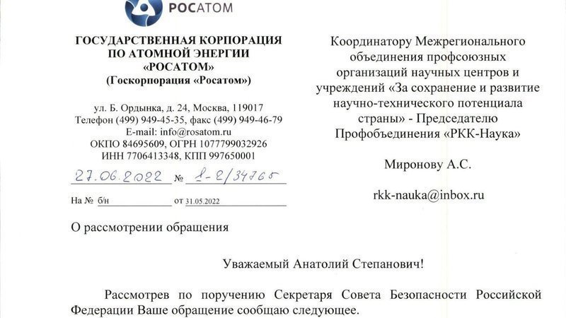 Фиксируем для истории ссылочку на письмо Росатома, присланное в ответ на обращение в Совбез РФ: