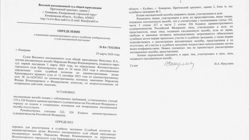 Вот в таком виде Восьмой кассационный суд прислал своё определение о возбуждении кассационного производства по иску об аннулировании "тысячелетней" лицензии на захоронение РАО 1-2 класса в континентальном центре страны (ЗАТО Железногорск Красноярского края). К нему так же неряшливо (сикось-накось и как попало) приложена копия кассационной жалобы. Видимо, в высокой судебной инстанции кто-то считает, что аборигенам и так сойдёт. Типа, здесь же вам не Америка, всё равно результат уже предопределён и будет направлен по старинному названию Сибири - на Хуирес. Эх, Россия-матушка, скорбна и нема...