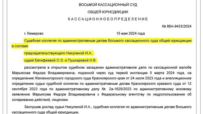 23 мая 2024 года в 23:01 (!) на сайте Восьмого кассационного суда было выложено кассационное определение по иску об аннулировании "тысячелетней" лицензии, который предусматривал частичную разморозку зарубежных активов РФ в размере более 10 млрд долл (с потенциалом обоснования до 150-170 млрд долл). В печатном виде определение Восьмого кассационного суда заявителю до сих пор не поступило, хотя мотивированное кассационное определение было изготовлено (как указано в самом определении) 15 мая 2024 года.
