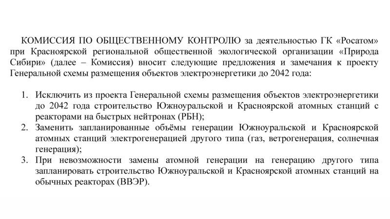 Сегодня заканчивается общественное обсуждение проекта Генеральной схемы размещения объектов электроэнергетики РФ. Направил организаторам предложения и замечания от имени Комиссии по общественному контролю. Предложил отказаться от планов строительства Южноуральской и Красноярской атомных станций на быстрых реакторах. И либо заменить атомную генерацию на другой вид электрогенерации, либо хотя бы заменить тип реакторов с РБН на ВВЭР. Помимо предложений обозначил позицию Комиссии по планам развития в РФ уран-плутониевой энергетики на быстрых реакторах: планы научно необоснованны, противоречат мировому опыту и действующему законодательству, создают угрозу национальной безопасности Российской Федерации.