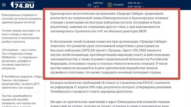 По итогам общественного обсуждения из доработанного проекта Генеральной схемы размещения объектов электроэнергетики исчез пункт "Красноярская атомная станция". Красноярцы одни из немногих, кому удалось сломать планы атомных бизнесменов. По сути единственные. Конкретно, это победа не каких-то абстрактных красноярцев, которым в массе своей всё по барабану, - это победа Комиссии по общественному контролю при КРОЭО "Природа Сибири", наших экспертов и тех, кто нас поддерживал все эти годы. И это моя личная победа.