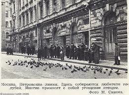 Существует множество архивных фото старой Москвы, голуби, другие птицы, кормушки на деревьях, специальные места кормления голубей.