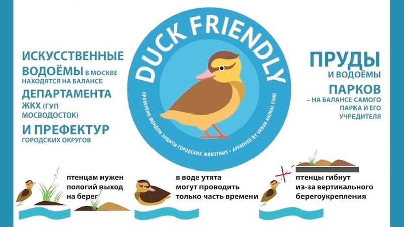 Первым шагом был запрос в департамент ЖКХ о балансодержателях прудов и других водоёмов - иначе говоря, кто распоряжается благоустройством водоёмов. Благодаря этой информации мы узнали, какие пруды в Москве являются безопасными для утят и обратились к балансодержателям с просьбой учесть необходимость пологих сходов для уток и присвоить ответственным прудам статус DUCK-FRIENDLY. Волонтеры-дизайнеры создали два макета наклеек-стикеров DUCK-FRIENDLY.