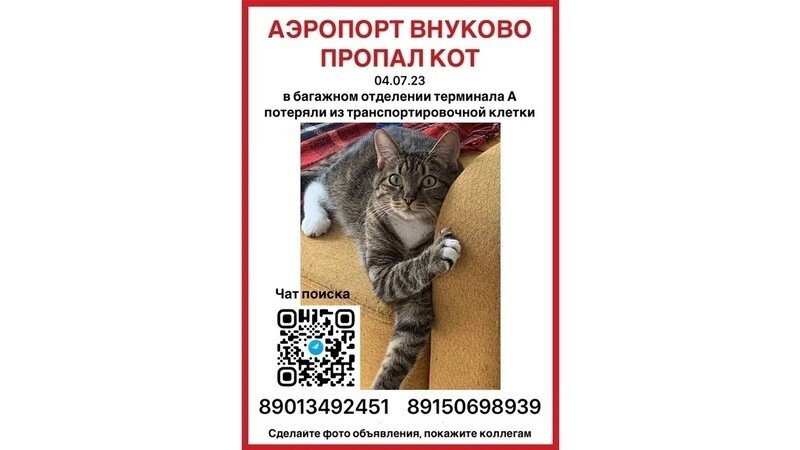 Мы, Фонд защиты городских животных, написали в наземные службы аэропорта, в авиакомпанию «Якутия», но процесс сильно тормозился из-за выходных. Организовали координацию поисков среди местных жителей и сотрудников аэропорта Внуково, призывали делиться объявлением с коллегами и соседями! Поиск прошел успешно благодаря максимальной огласке.