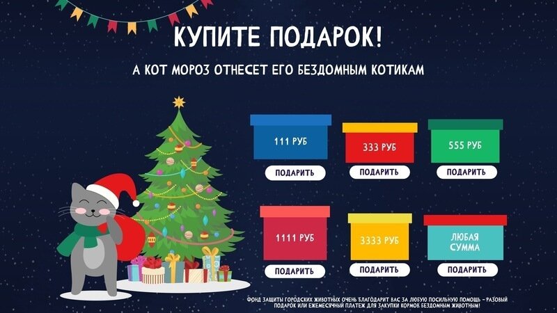 В этом году проект еще интереснее: пожертвования пользователей участвуют в розыгрыше подарков, связанных с котиками и Новым годом.