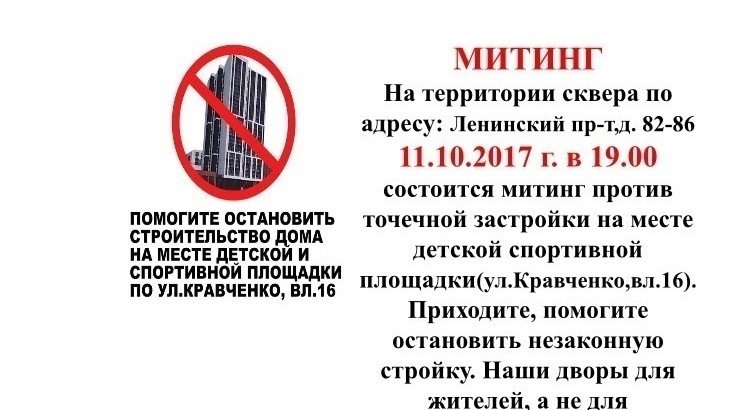 11.10.2017 в 19.00 на территории народного парка по адресу Ленинский проспект дом 82-86 состоится МИТИНГ против точечной застройки на детской и спортивной площадке на Кравченко вл.16. Приходите! Помогите остановить строительство! Нас услышат-когда нас много!!! Наш двор для жителей, а не для застройщиков!