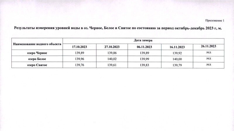 Из последней информации: проведенное «с 20 по 27.11.2023г. АО «Мосводоканал» наполнение озера Черное до повышения его уровня на 45см»-(?очередное сомнительное утверждение ), в связи с критическим обмелением озер Черное и Белое в летний сезон прошлого года (приложение 1) - по факту не получило одобрения научного представителя на совещании в ДПиООС по этому вопросу. Причины резкого обмеления озер с пересыханием родника на оз.Черное остались невыясненными.